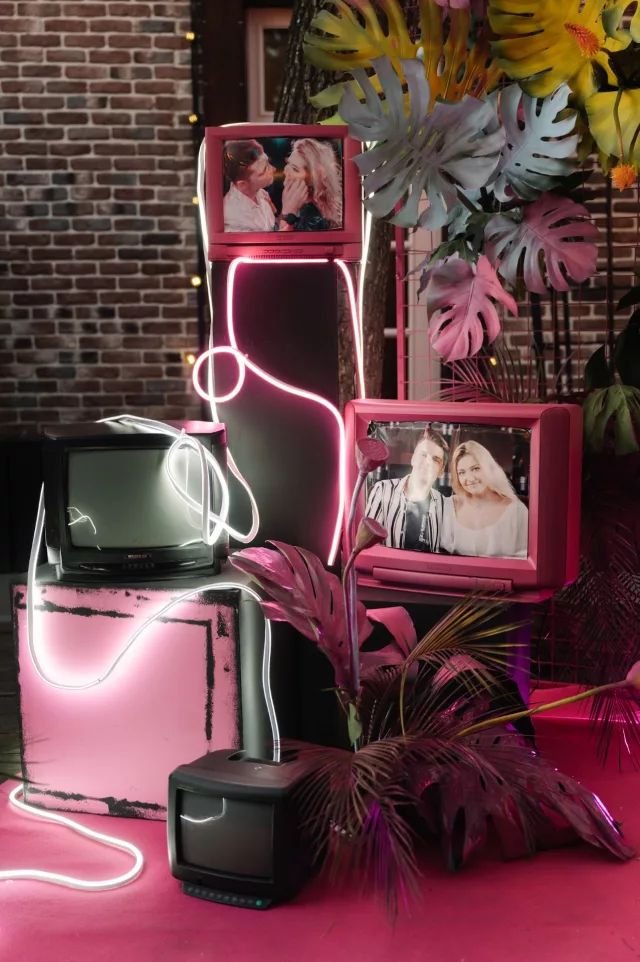 Tel üzerinde neon tabelalar ve çiçekler ile nostaljik bir parti atmosferi yaratın.