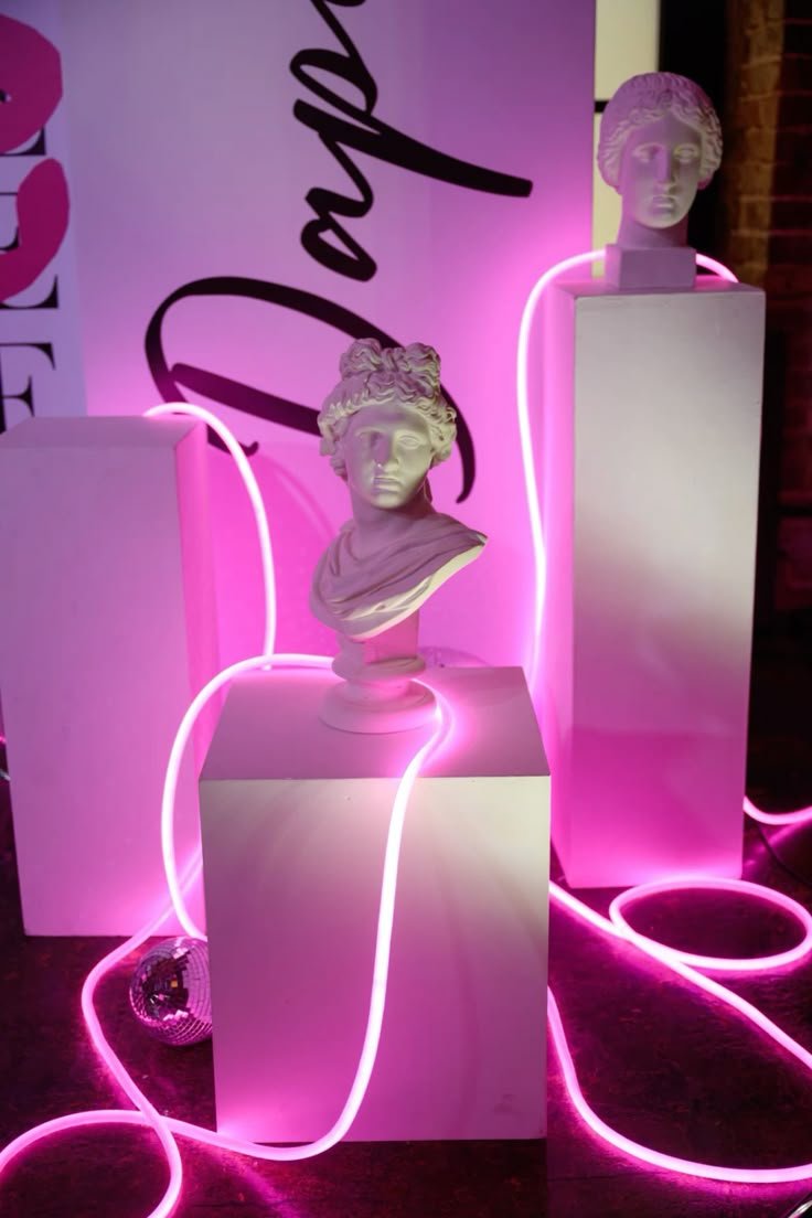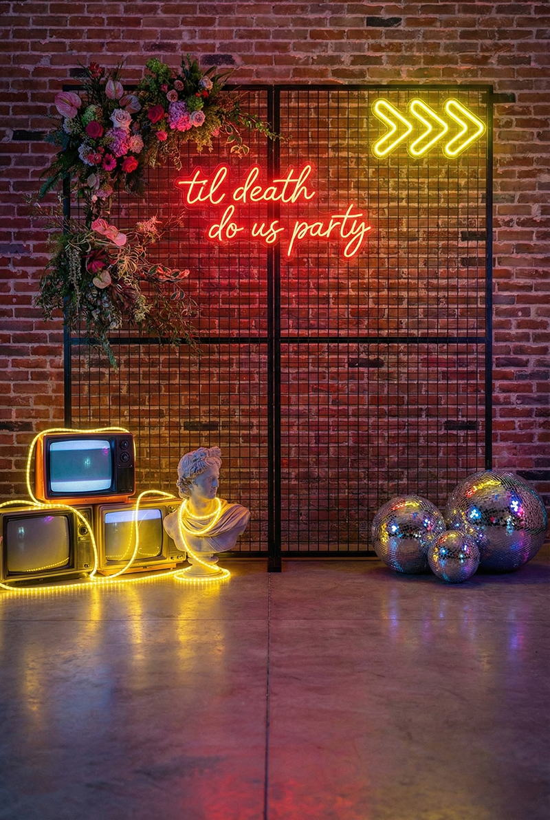 Tel üzerinde neon tabelalar ve çiçekler ile nostaljik bir parti atmosferi yaratın.